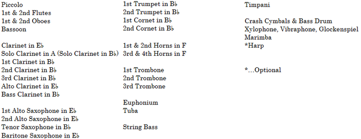 この吹奏楽編曲は、オイレンブルグ版の管弦楽スコアを元に編曲、ソニックアーツ社より出版(現在は絶版)していたものを大幅に改訂したものです。オーケストレーションの変更については、指揮者である時任康文氏に多くの助言をいただき、アーティキュレーションやフレージングなどは、管弦楽で多く用いられているリコルディ版も参考にしています。ソロ・クラリネットは音色を考慮し原曲通りのA管を指定しましたが、Bb管用のパート譜も同梱してありますので、バンド(演奏者)の事情によって使い分けてください。金管楽器(Hrn, Trp, Trb)は原曲に近い編成ですが、コルネット、ユーフォニアムも含めて吹奏楽編成に最適化するように、音の変更がしてあります。原曲では[K]の部分のみでハープが2台使われていますが、ヴィブラフォンとマリンバで演奏できるようにしてあります。オプショナルでハープを入れる場合は、[K]のヴィブラフォンは休んでください。