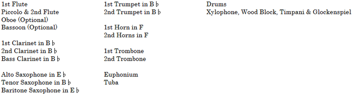 この小編成版は、小江戸ウインドアンサンブル 1stコンサートのためにアレンジしたものを元に、今回の出版にあたって、オーボエ、バスーンをオプショナルとして追加しました。初演時の人数は、クラリネットが各2名、後のパートは各1名でしたので、最小20名で演奏できますが、実際には各パートの人数は多くても問題ありません。打楽器も2パート、ドラムセットを数名で分けて、バスドラムはグランカッサ(大太鼓)で、シンバルは合わせシンバルで演奏しても良いでしょう。
