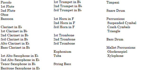 基本的に明るいサウンドを心がけ、Trio以降、89小節目からのレガートをどう生かすかが演奏の大きなポイントになるでしょう。言うまでもありませんが打楽器セクションは曲の推進力を保ち、常に全体をリードする立場でありたいです。119〜120のクレッシェンドに伴う121からのダイナミックスはあえて表記してませんから、指揮者の判断で自由に解釈していただきたいです。