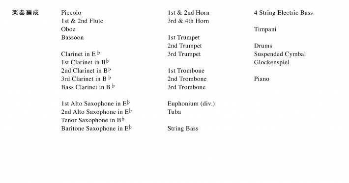 この作品は、大江戸シンフォニックウィンドオーケストラの第3回定期演奏会作品公募の入選作品として、樫野哲也指揮、同団によって2014年5月6日に初演されました。元々は2012年に2管オーケストラ(大編成)のために書いた作品でしたが、その作品公募をきっかけとして吹奏楽編成に編曲しました。
